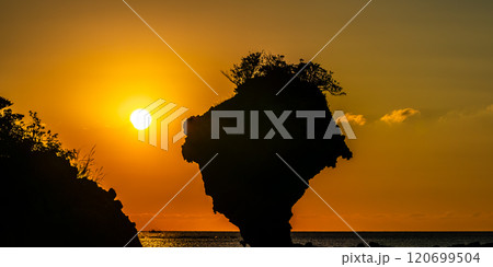 りんご岩(傘岩)の夕陽 柿泊海岸 ながさきサンセットロード パノラマ 【長崎市】