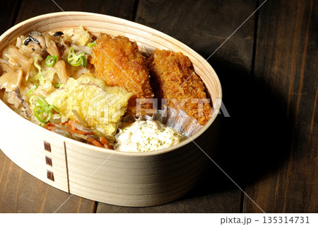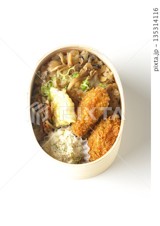 きのこご飯とカキフライ弁当を白背景で撮影