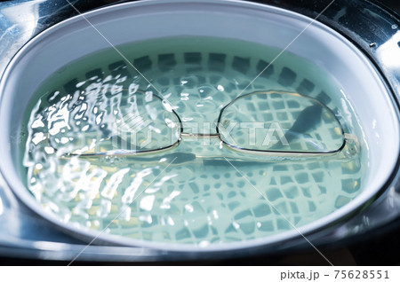Ultrasound cleaning of glasses in solution. Optical technician repairs the frame of glasses