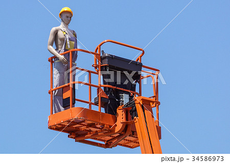 Worker in self propelled boom lift basket in uniform on a building steel framework background