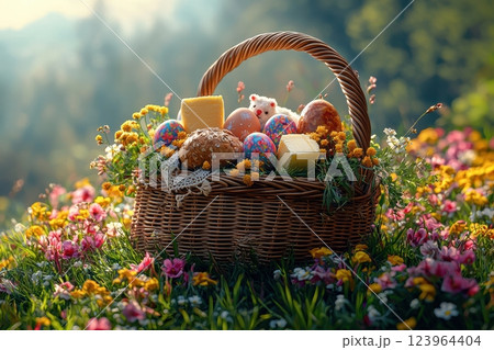 An Easter Basket Surrounded by Vibrant Colorful Flowers in a Joyful Celebration Scene