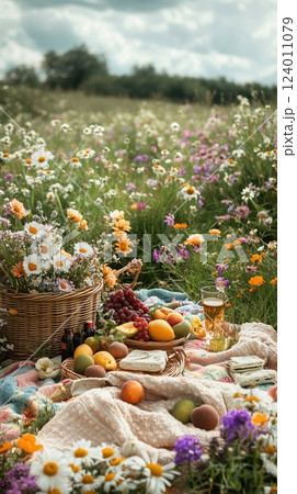 Colorful picnic setup on a lush meadow filled with blooming wildflowers and a wicker basket