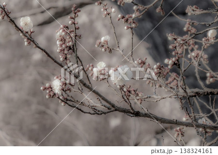 岩手公園、盛岡城公園の石垣と白梅の花 北国の春の訪れ 白梅のほころびに北国の春の目覚め