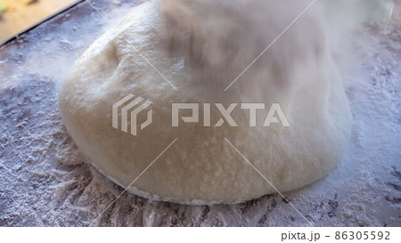 正月準備の餅つき(のし板に広げた餅とり粉の上の餅)