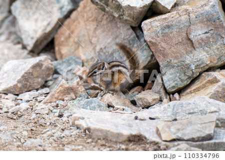 Chipmunk foraging on a rock crevice. Close-up shot.