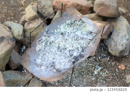 焚き火台で燃え尽きた薪と余韻の残るキャンプシーン