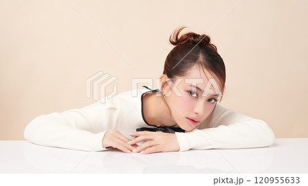 Beautiful young asian woman with clean fresh skin on beige background, Face care, Facial treatment, Cosmetology, beauty and spa, Asian women portrait.