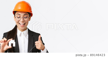 Close-up of happy pleased asian female architect, construction engineer in helmet and suit looking at home miniature and showing thumbs-up, guarantee quality of repairment works, white background