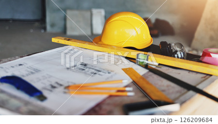 Architecture, blueprint and drawing tools with hard hat for industrial renovation, building design and planning. Safety equipment, scale and floor plan at construction site for project development