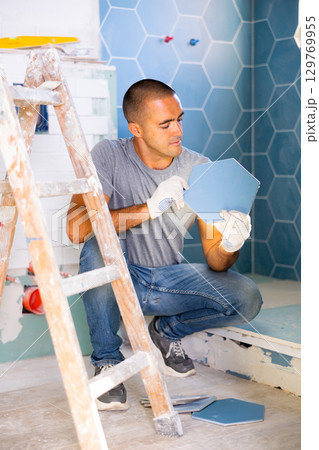 The technology of laying tile, repair and decoration. Focused man puts porcelain tiles on wall sitting squat at bathroom