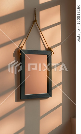 Small black frame pink matte hanging beige wall warm sunlight shadow