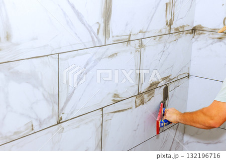Worker is applying adhesive to marble style tiles on kitchen wall