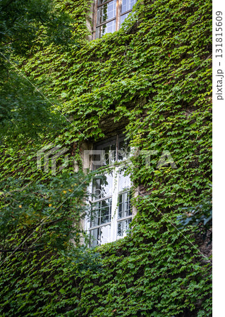 Green facade. Ivy covered building. Vine creeper around window on facade house covered wild grape