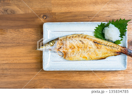 カマスの塩焼き 大根おろしと大葉を添えた和食の焼き魚