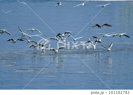 青い海で羽ばたく身近な海辺の渡り鳥ユリカモメ