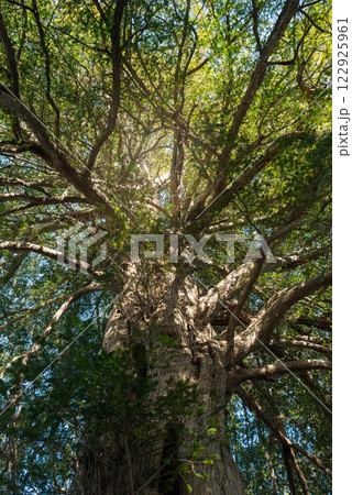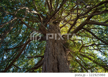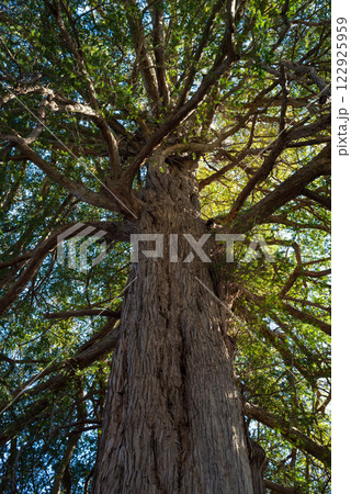 空を覆う緑のかやの木、日本の巨樹。