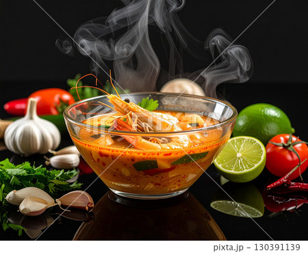 AI generated Aromatic tom yum goong soup served in a modern glass bowl with rising steam, placed on a sleek black glass table with reflective surface surrounding ingredients