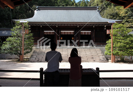 若いカップルが参拝する神社