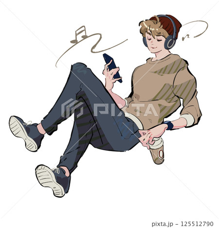 ヘッドフォンで音楽を聴いている男性のイラスト 長袖 秋 冬
