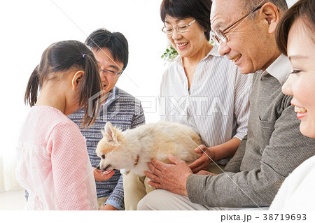 犬の世話をする3世代家族