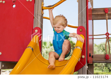 Little toddler boy sitting on playground