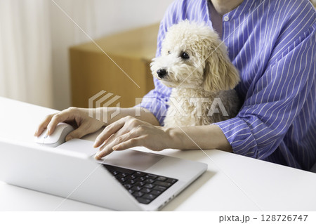 テレワーク 飼い主さんに抱っこされている犬