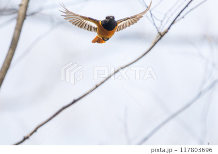 飛び出し飛翔する可愛いジョウビタキ(ヒタキ科)埼玉県熊谷市荒川大麻生公園2024年4月