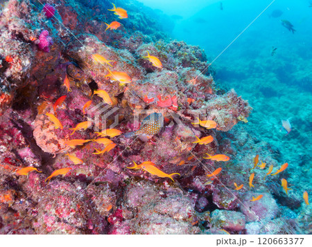 ツノダシ、キンギョハナダイ他の群れ、イボヤギの壁面。ヒリゾ浜中木南伊豆町伊豆半島静岡県2024