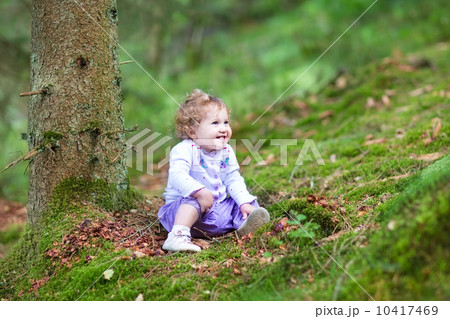 Happy laughing baby girl playing in a beautiful pine wood forest