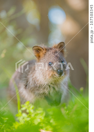 最も幸せな動物、クオッカが楽しそうに草の中に座っている、ポートレート撮影、ロットネスト島、西オースト