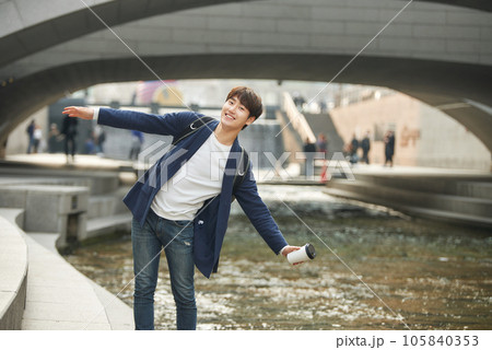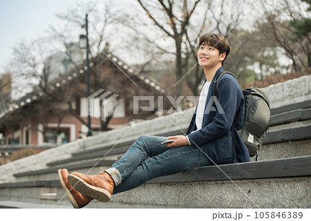 A young man taking pictures with a smartphone camera in Seoul, Korea's representative city