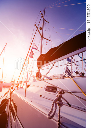 View of harbor with yachts details. Beautiful sunset sky in the marina bay.
