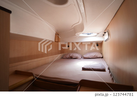 Cozy bed on a voyage boat with a window overhead with natural light