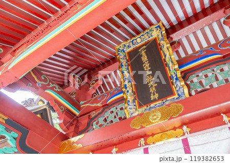 寺院の山門に掲げられた扁額と朱色の伝統建築のディテール