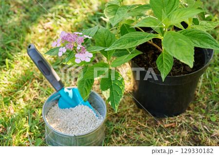 Close-up of Hydrangea plant in pot and granular fertilizer, outdoor in garden, top view