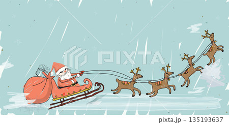 Santa Claus on sleigh with reindeers hand drawn childish style on sky background have blank space graphic illustration. Merry Christmas greeting card template.