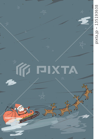 Santa Claus on sleigh with reindeers hand drawn childish style on night sky background have blank space graphic illustration. Merry Christmas greeting card vertical template.