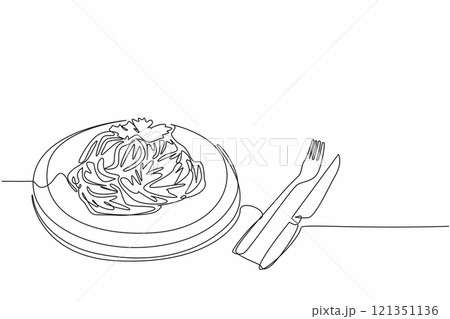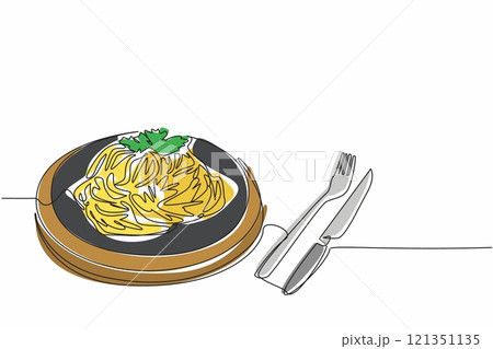Single one line drawing spaghetti carbonara on black round plate with a round wooden cutting board. Classic restaurant style dishes. National Carbonara Day.