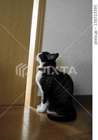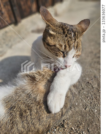 猫のいる風景。住宅の玄関でくつろいでいる地域猫