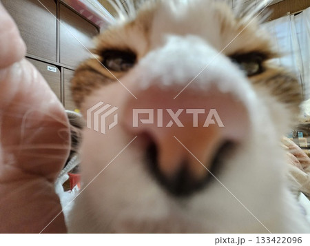 シーツのくるまれてこちらを向くきじしろ猫の顔 アップ