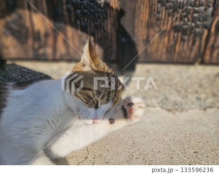 日向ぼっこでお昼寝の白キジ猫ちゃん