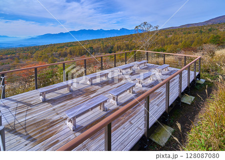 秋の山梨県北杜市美し森山の木製階段横の休憩所から南側の眺望(富士山,南アルプス等)