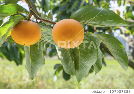 果樹園に実った柿の果実 鳥取県 輝太郎柿