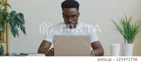 Man Concentrating on Laptop in Bright, Minimalist Room