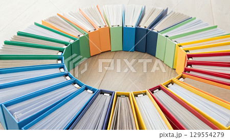 Vibrant business folders displayed on office shelves with assorted document covers in front view