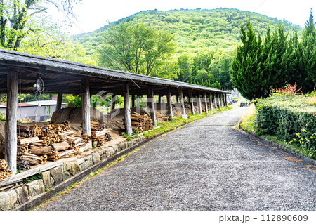 日本六古窯の一つ備前焼の里 積まれた窯の薪と伊部の街並み2 岡山県備前市