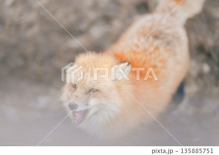 冬の雪原で捕食するキタキツネの野生の姿(北海道)