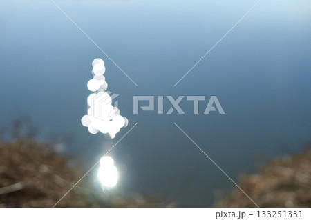 キラキラと光が反射する凍った湖面のローアングル画像。