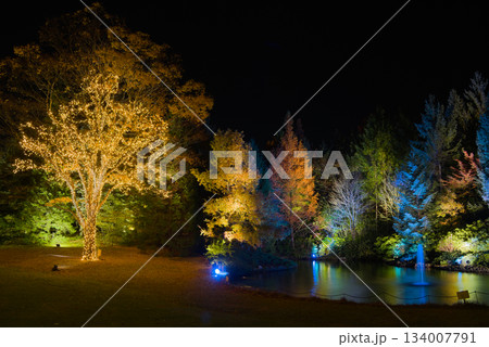 輝くライトツリーと池が彩る仙台ロイヤルパークの夜