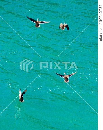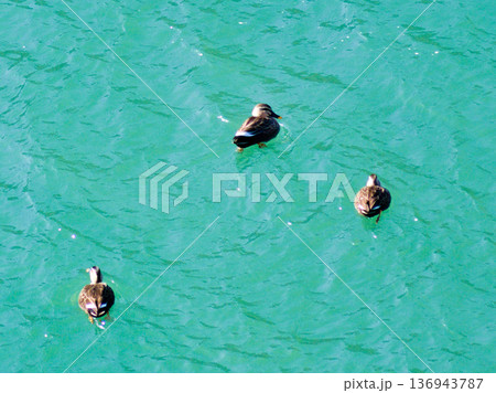 エメラルドグリーンの水面を泳ぐカルガモの群れ:清らかな水辺の風景